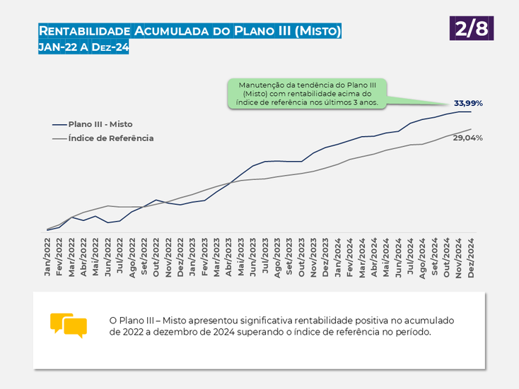 Em 2024, a rentabilidade alcançada pelo Plano III foi de 8,05%, que chegou perto do índice de referência para o ano, que era de 9,17%. O índice de referência previsto não foi alcançado por conta do baixo desempenho dos fundos das classes de investimento Renda Fixa Inflação e Estruturado que foram impactadas pelo aumento das taxas de juros e pelo retorno negativo da bolsa de valores brasileira.