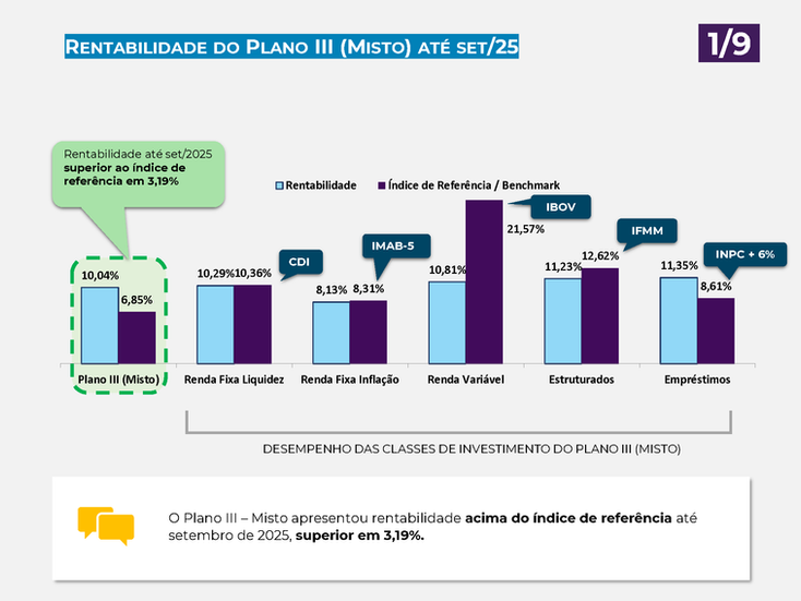 Em 2025, os destaques de retorno até setembro foram operações com participantes (11,35%), estruturados (11,23%), renda variável (10,81%) e renda fixa (9,19%). Em setembro, o Plano III tinha R$ 927,4 milhões de patrimônio, com carteira concentrada em renda fixa (81,72%), seguida de estruturados (13,41%), operações com participantes (4,28%) e renda variável (0,59%).
